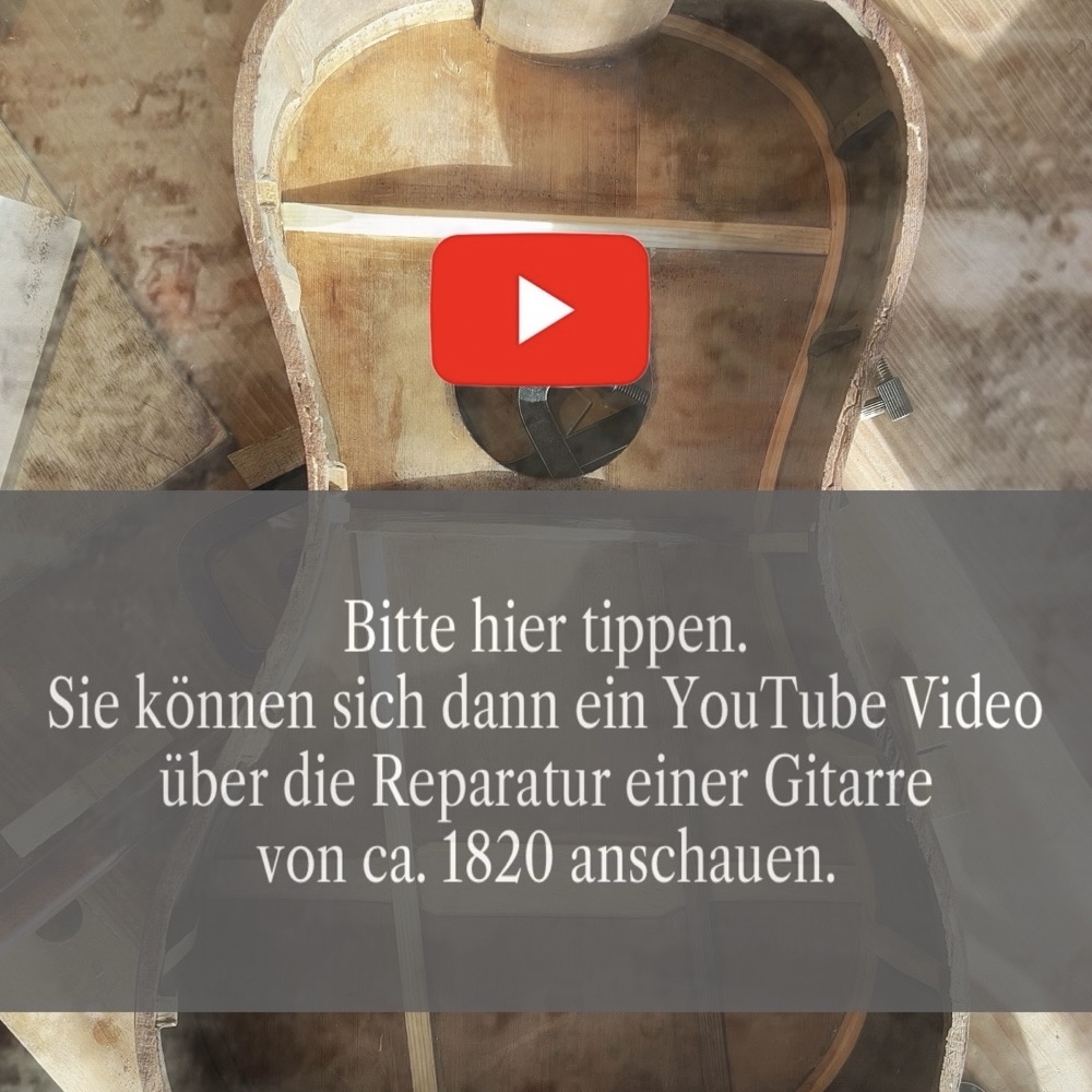 Ich restauriere immer mal wieder alte Gitarren. Bei dieser handelt es sich um eine, wahrscheinlich deutsche, Gitarre von ca. 1820. Sie war sehr mitgenommen, und wurde in den letzten hundert Jahren nicht gut behandelt. Es ist ein Familienerbstück eines Kunden gewesen, der sie für eines seiner Kinder fertig gemacht haben wollte. Auch ich habe für zwei meiner Söhne Wandervogelgitarren von ca. 1920 wieder zum klingen gebracht. Bei diesem Beispiel hier, war die Decke sehr von Würmern mitgenommen, und einige Balken mussten ausgewechselt werden Der Boden war aus Mahagoni und leider sehr zerrissen. Hals und Kopf waren aber noch im guten Zustand.